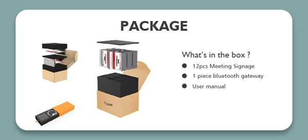 Es ist eine App-gesteuerte Bluetooth-Meeting-Signage, mit der Sie Ihr Meeting einfach und effizient einrichten können.